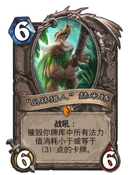该栏目在介绍各类卡组时,几乎总会提及同一个版本——“勇闯安戈洛”。笔者也曾多次将其称为“拯救炉石的版本”,事实也的确如此:它打破了前一个版本“龙争虎斗加基森”的恶劣环境,在一个正确的节点上凭借扎实而有趣的设计将游戏拉回了正轨.....当然,那是后话。 在此版本中,元气骑得到了精简牌库的手段——“丛林猎人”赫米特。