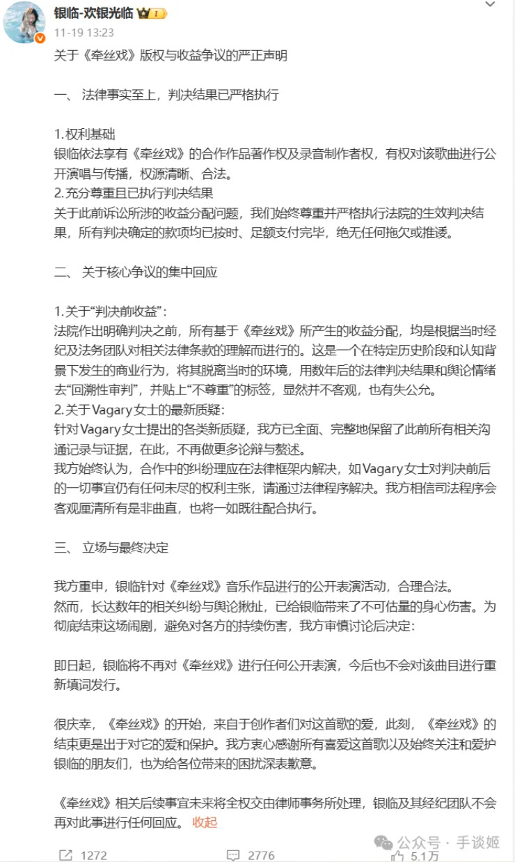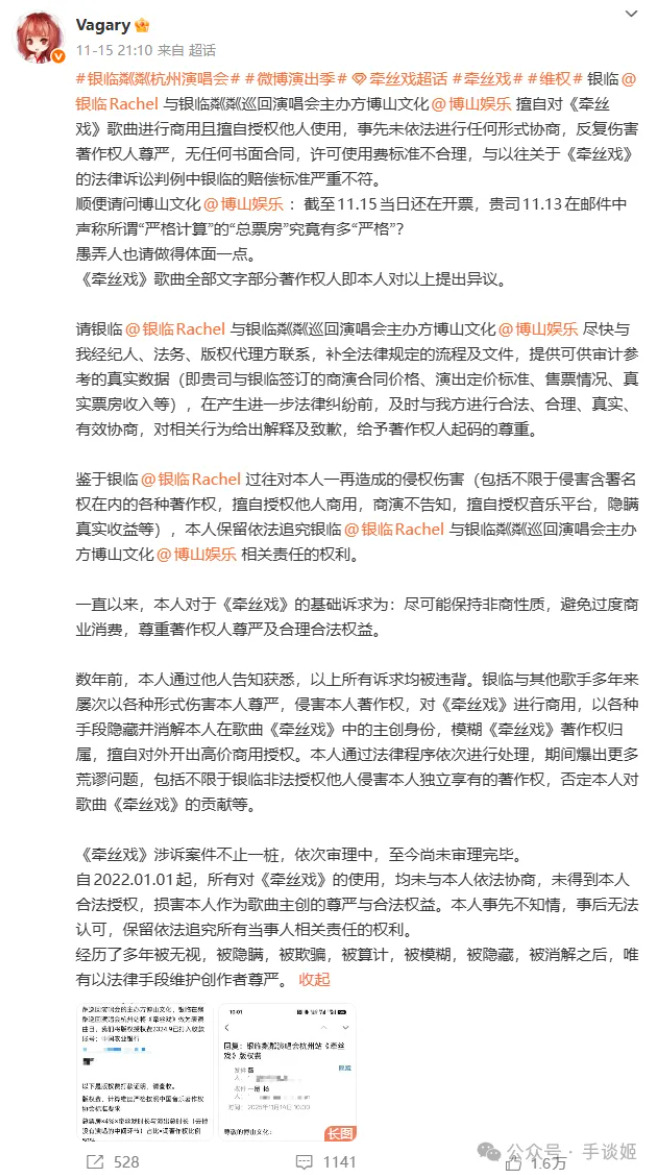 前面我们说了,这首歌算是银临的代表曲之一,自然在演出的时候会进行演唱,但是大家要知道一件事——银临参加的那些演出可不是什么公益义演啊,那是商业行为,会有钱赚的。于是在11月15日晚间,《牵丝戏》作词Vagary在微博上发文,表示银临和博山文化擅自对《牵丝戏》歌曲进行商用且擅自授权他人使用,未与词作者Vagary协商,无书面合同,且支付使用费标准不合理。过往银临存在多次“侵害”《牵丝戏》著作权的行为,包括擅自授权商用、隐瞒收益、模糊著作权归属等。Vagary要求银临和博山文化尽快联系她,补全法律流程及文件,提供真实数据,并对相关行为作出解释和致歉。Vagary在最后还指出,《牵丝戏》涉及的侵权案不止一件,不过目前都在审理中。