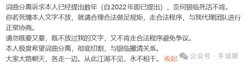 但这个回复很明显不能让Vagary满意,于是她又发了几篇微博,除了收益合同化、透明化,她还希望自己的主创身份不要被模糊,值得一提的是,她表示自己曾经让银临“词曲分离”,找人重新填词重新发行这首歌,但银临并没有做。