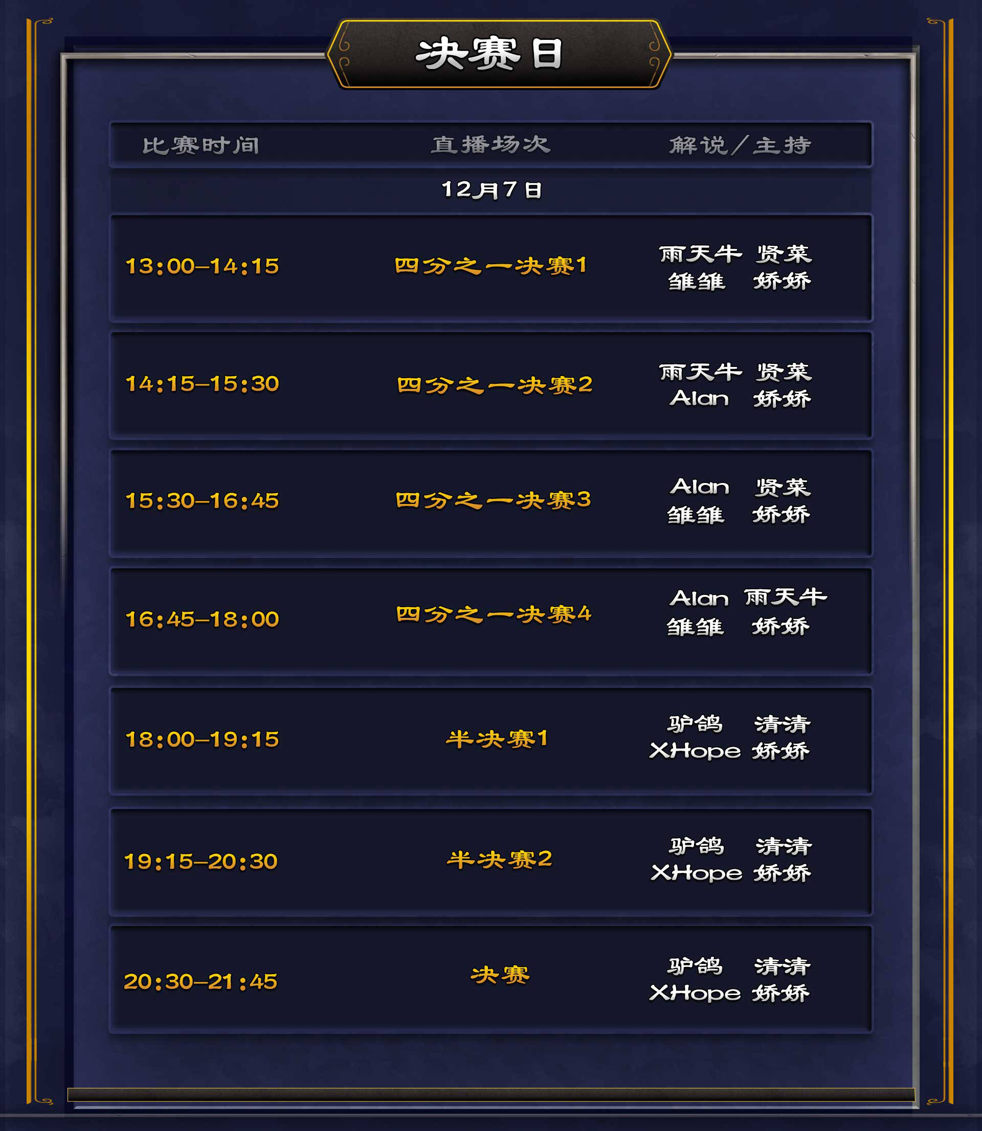 北京时间12月1-7日(小组赛15:00起,淘汰赛13:00起,详见当天节目单)