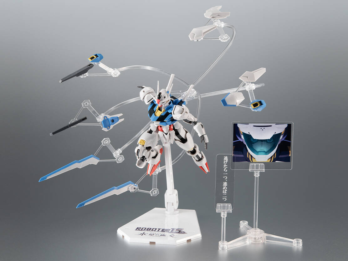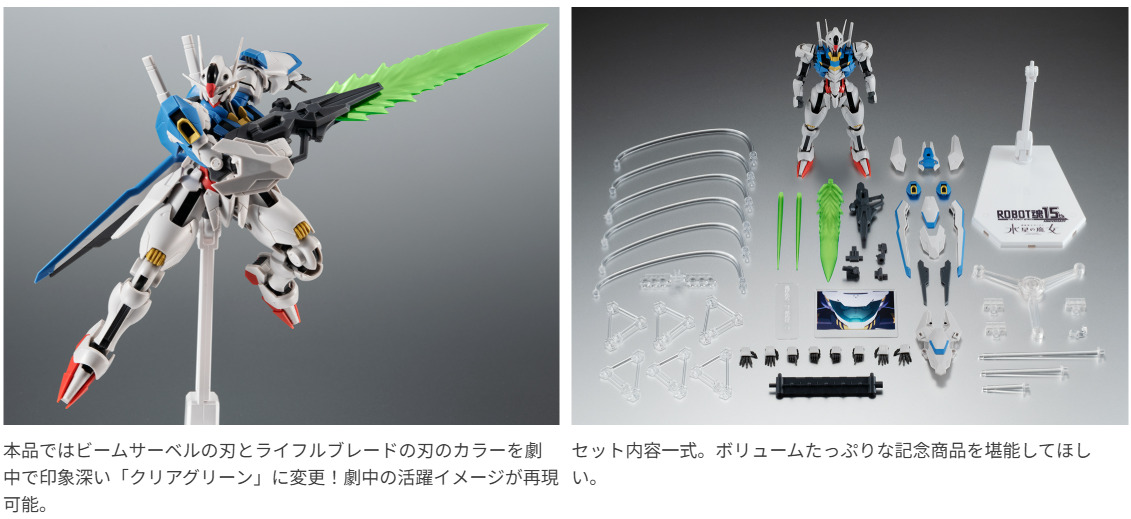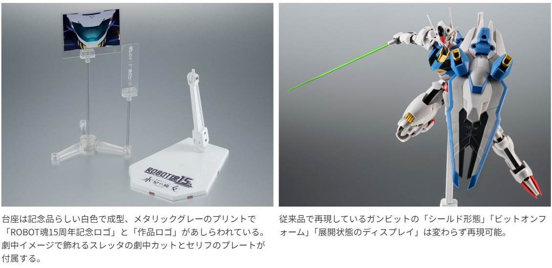 従来の「ガンダム・エアリアル ver. A.N.I.M.E.」にROBOT魂15周年を記念したオリジナル台座とキャラクターカットインシートが新たに付属!更にサーベルやブレード用のビームエフェクトは劇中で使用されていたグリーンに変更!