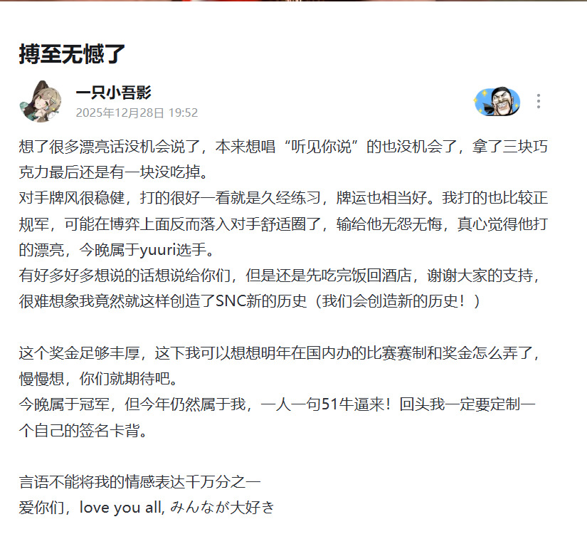 虽然遗憾未能夺冠,但吾影选手一路披荆斩棘,从2020年刚开始参赛默默无闻,持续战至今日取得SNC选手在WGP上的历史最佳成绩,已经证明自己和SNC选手有冲击世界冠军的锐气!