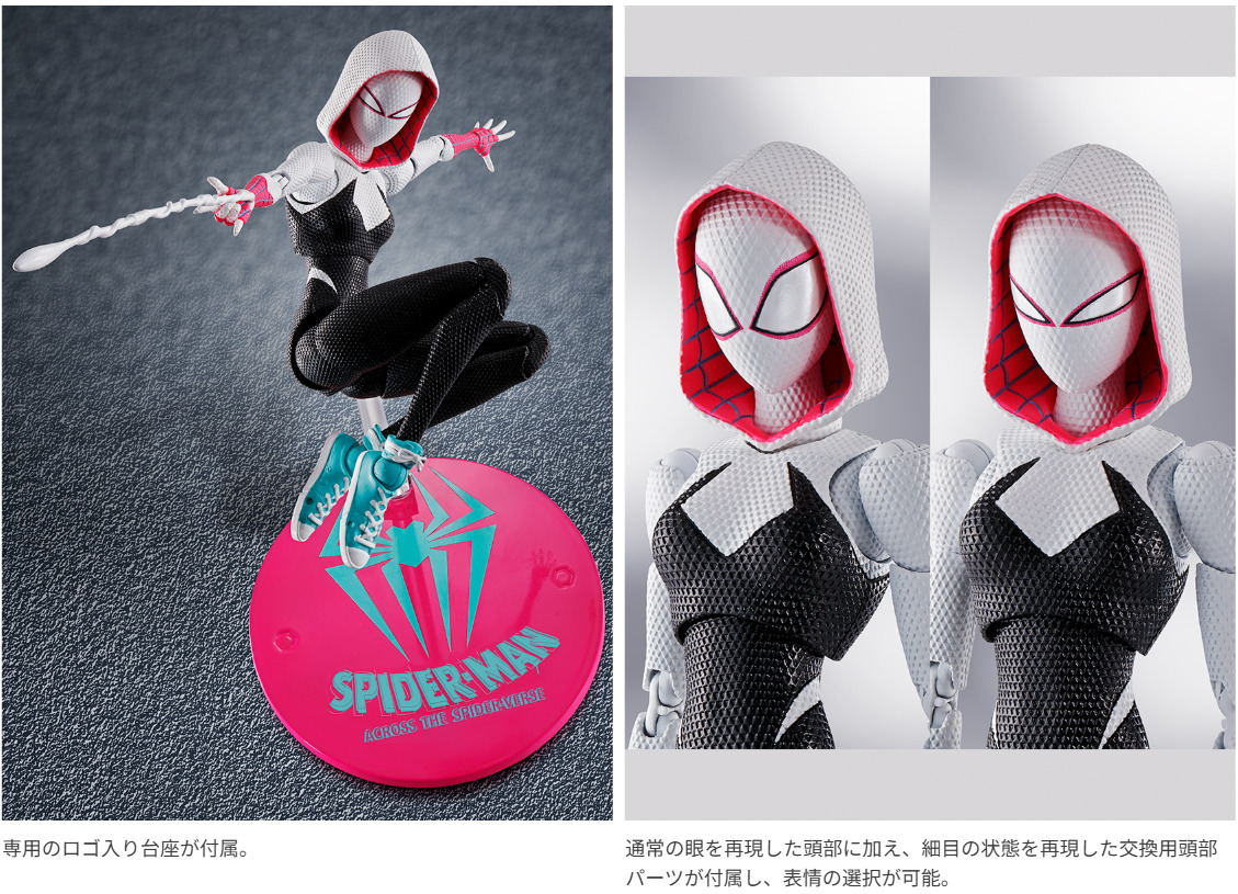様々な世界のスパイダーマンが一堂に会する映画『スパイダーバース』最新作より、もう一人の主人公「スパイダーグウェン」が最新のコスチュームで登場!表情豊かな交換用頭部パーツや素顔、専用台座付属の豪華仕様!