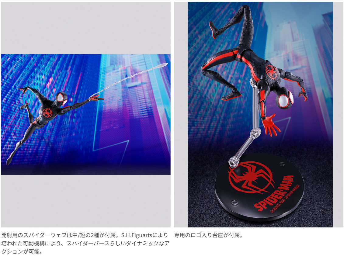 『スパイダーマン:アクロス・ザ・スパイダーバース』より主人公の「マイルス・モラレス」が商品化!素顔パーツ2種に加え、スパイダーウェブは長/中/短の3種が付属。ダイナミックなアクションを再現可能。
