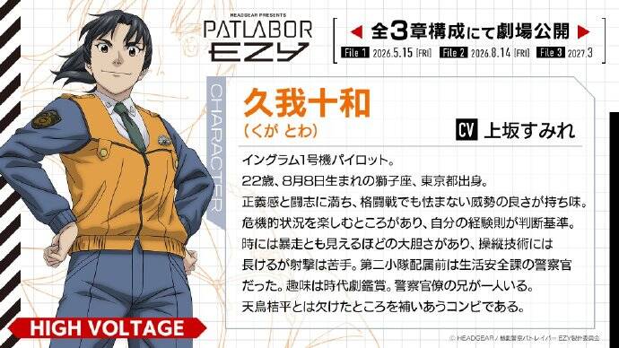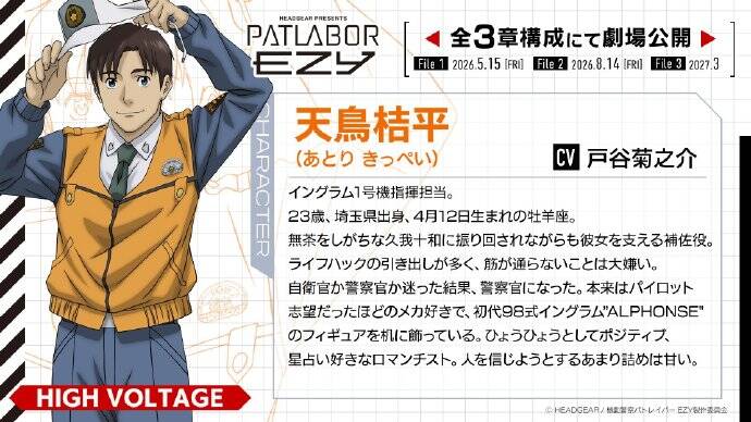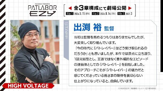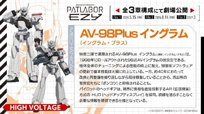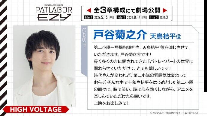 机动警察系列动画新作《机动警察Patlabor EZY》特报公开,确定全8集(第1~6集单集完结、7~8集连续剧情),以分成三章影院上映的形式与大家见面,依次于2026年5月15日、2026年8月14日、2027年3月上映。已经公布的主演配音演员为上坂堇与户谷菊之介。