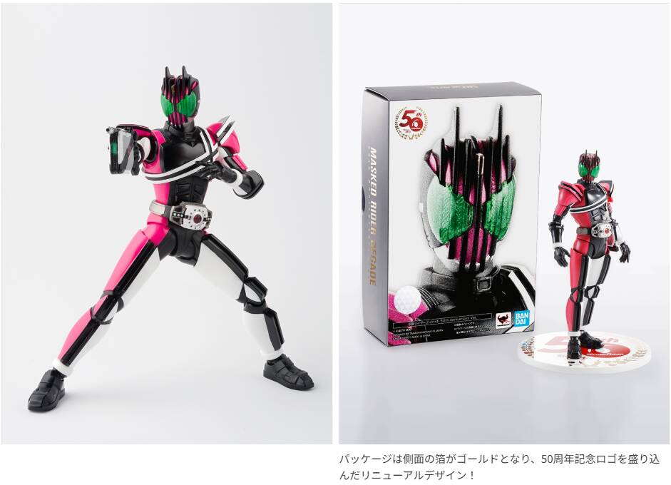 仮面ライダー生誕50周年記念ロゴを配したデザインの台座をプラスした50th Anniversary Ver.のシリーズに、2016年発売の「S.H.Figuarts(真骨彫製法)仮面ライダーディケイド」が参戦!