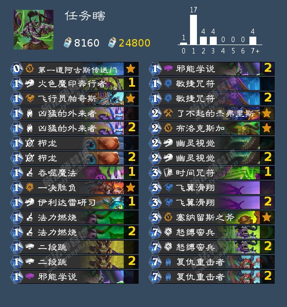 kuliyan投稿的任务瞎,为了卡组润滑更快超展开,构筑上舍弃了滑翔,携带了两个栉龙。能优开环境里的所有术士,大优宇宙卡组尤其是宇宙萨,比较劣战士和德鲁伊,栉龙对过牌做任务很有帮助,其他玩法就和传统奇闻任务瞎一样,如果环境里otk(德鲁伊,光速牧)比较多可以换回滑翔。