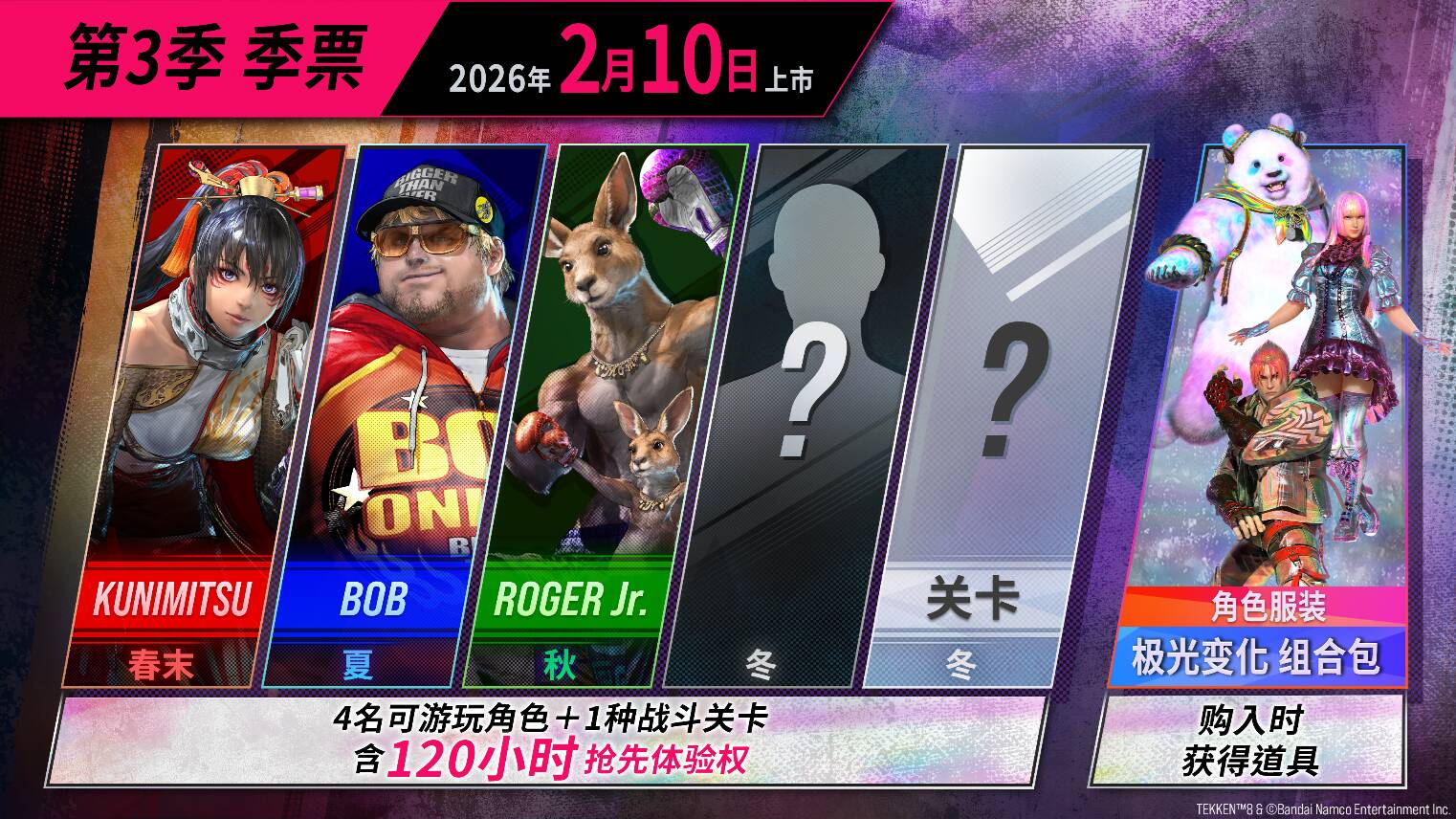 第3季宣传视频已在"TEKKEN World Tour 2025 Global Finals"中公开,并公布了即将在第3季登场的追加可游玩角色"Kunimitsu"、"Bob"、"Roger Jr."。