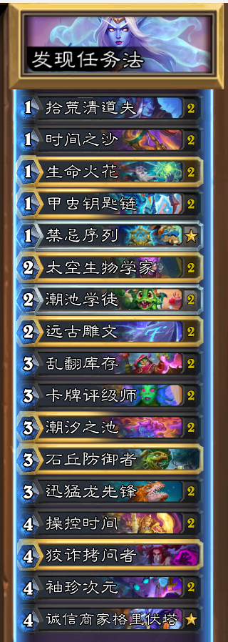 标准发现法,起因是开包出了一张异画任务,版本末期没啥事,就研究一下,发现整个卡组听顺滑,特别是有了新卡之后(时间之沙),胜率不错,不坐牢。