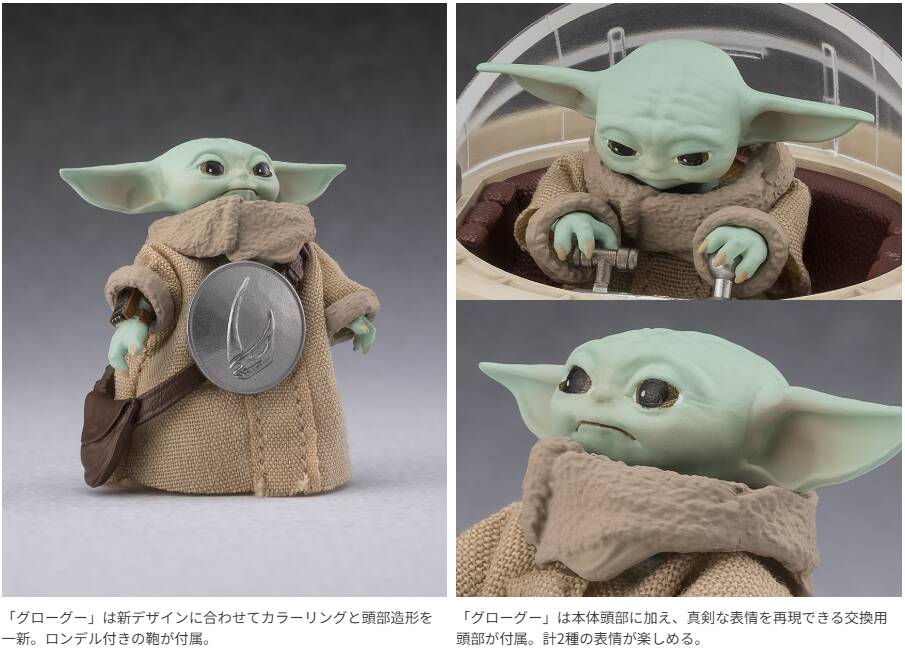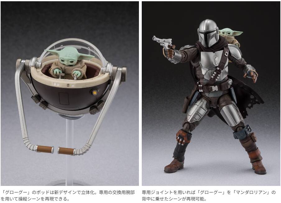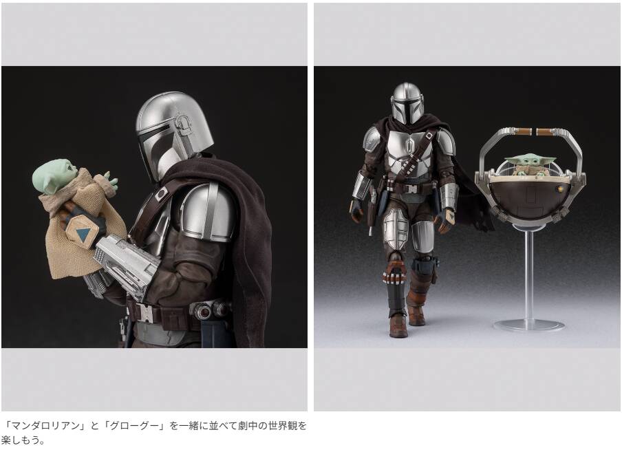 映画『スター・ウォーズ/マンダロリアン・アンド・グローグー』から主人公の「マンダロリアン」とフォースを秘めた特別な子どもである「グローグー」がセットでS.H.Figuartsに登場。新デザインに合わせて「マンダロリアン」と「グローグー」は一部を新規に造形。「グローグー」には欠かせないポッドも完全新規造形で付属し、さらに「グローグー」の衣装は布仕様で再現。