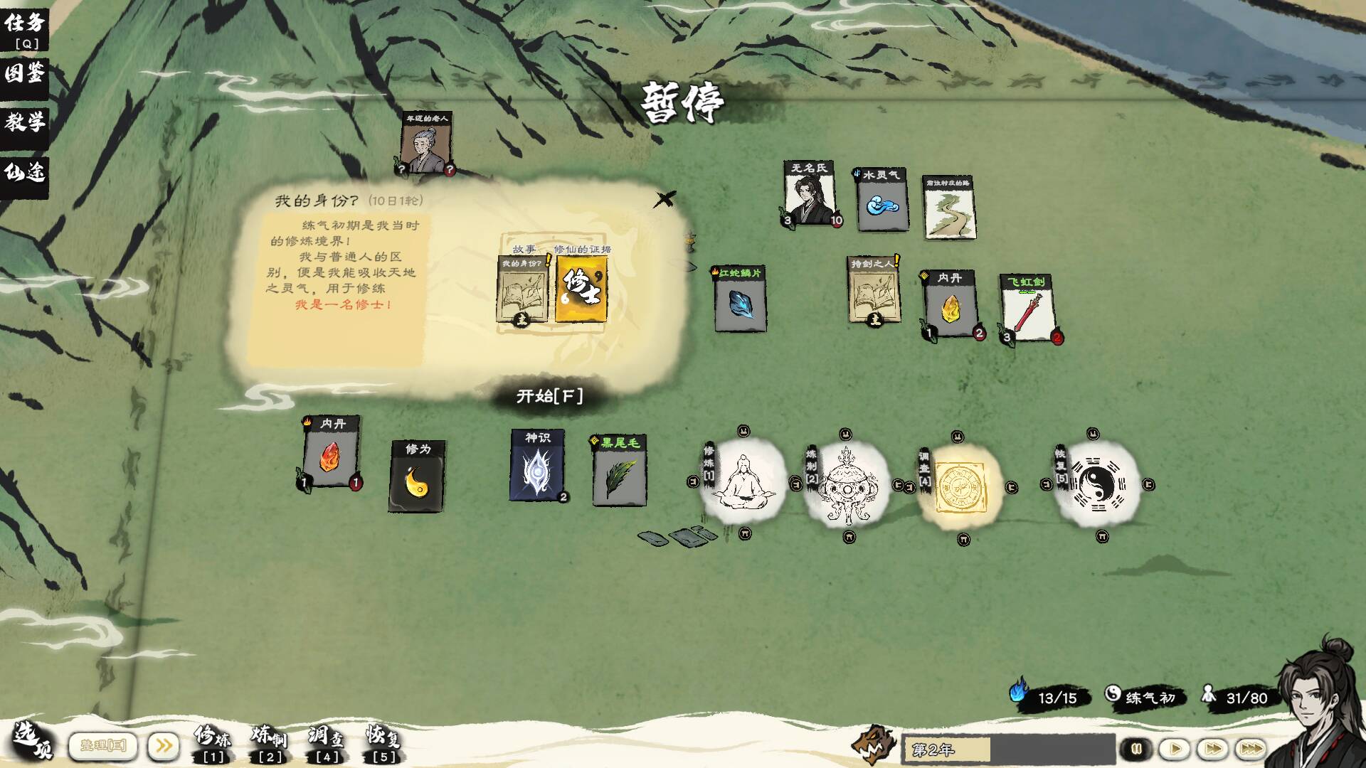 比如修炼这件事。传统RPG里你点一下技能树,数值就涨了。但在《卡牌修仙传》里,你得把自己的角色卡和天地灵气卡一起拖进“修炼”工作台,等进度条走完,它才会吐出一张“修为”卡给你。两张“思绪”卡合在一起,会变成“感悟”卡。两张“感悟”卡再合成,就能炼成一本“心法”。这种把抽象概念层层具现化的设计,初上手会觉得有点繁琐,但一旦接受了这个设定,那种“一切尽在掌握”的感觉,确实比干巴巴的数值增长要来得更有意思。