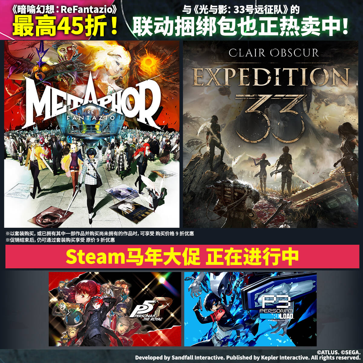 此外,Steam现已推出Kepler Interactive的法国JRPG《光与影:33号远征队》与ATLUS的《暗喻幻想:ReFantazio》联动捆绑包,购买套装享受原价9折优惠。由开发团队称受《女神异闻录5》启发创作的《光与影:33号远征队》,以及由制作了《女神异闻录3》到《女神异闻录5》三作的制作班底打造的最新作《暗喻幻想:ReFantazio》组合而成的优惠套装,一次入手两款佳作,让你的春节假期沉浸在JRPG的世界中吧!