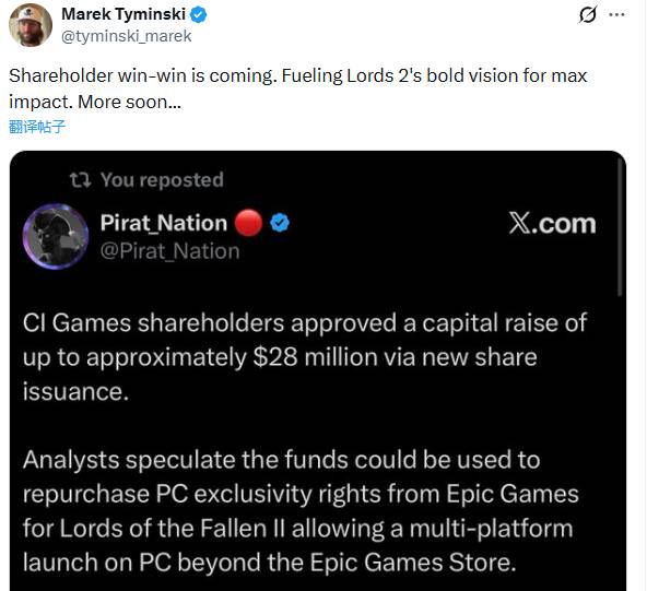 Marek Tyminski在推上转发游戏博主Pirat_Nation的推文,并评论称即将达成一个股东双赢的局面,旨在为《堕落之主2》创造最大影响力。面对期待Steam版的玩家,他也给出积极回应。