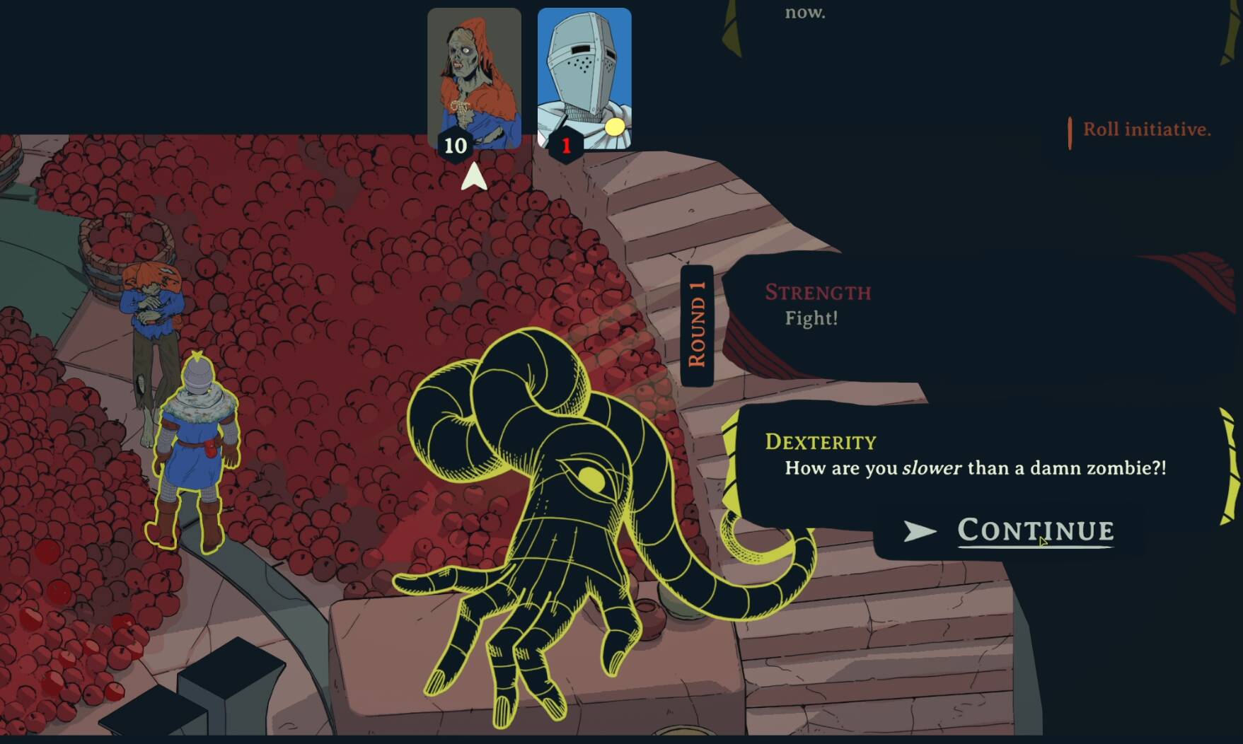 骰子主宰着游戏中的一切——小到获取信息、偷窃物品、击败一只死灵,大到说服他人协作、搜刮大批财物,或是战胜强敌。将一切都交给你的运气,也学着接受失败,毕竟失败才是常态。游戏中玩家也能收集到一种特殊的石头,可以用来重试某些失败的检定。如果你想成功,那就去骰吧。