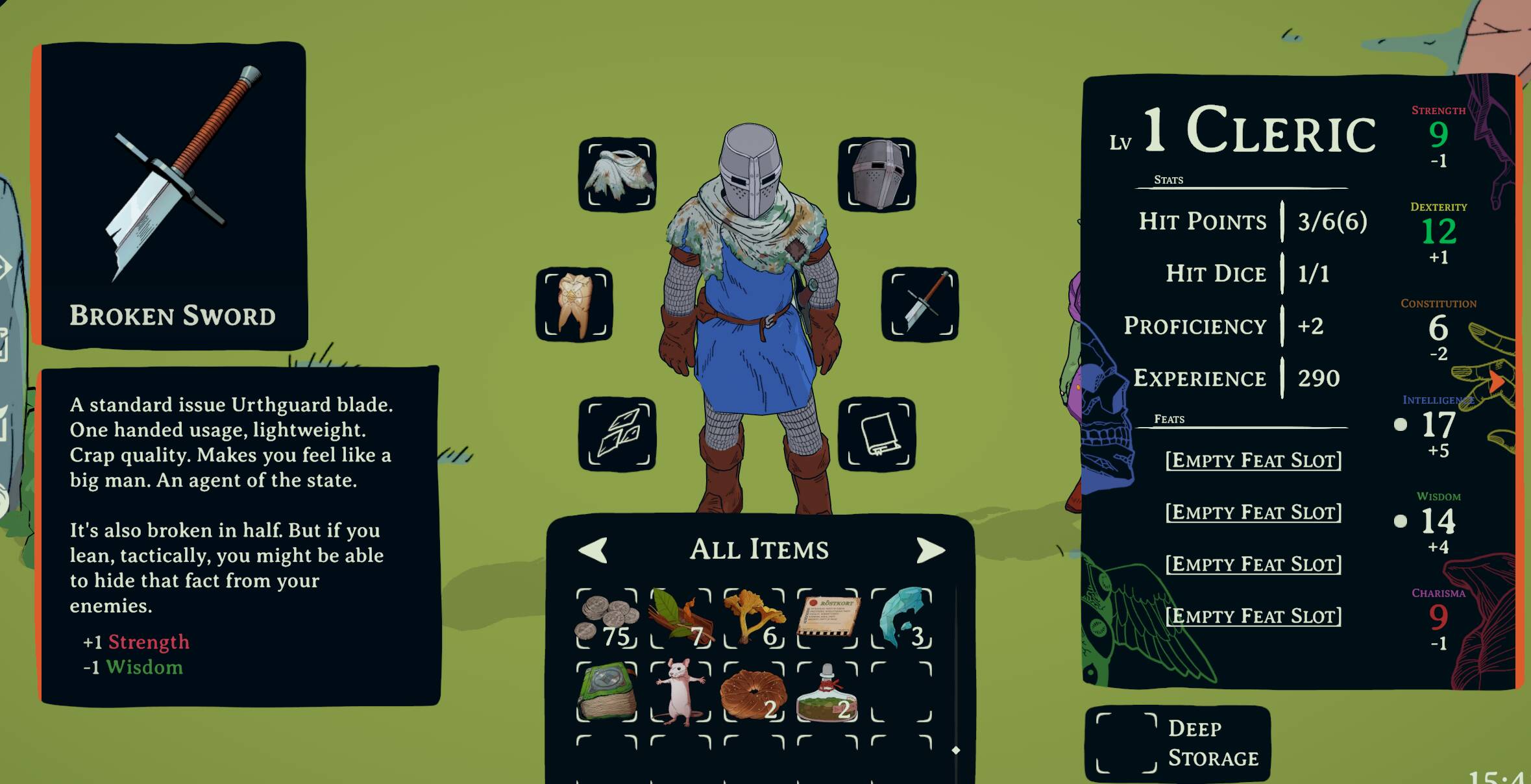 玩家也能在游戏中收集到各式装备。与传统的TTRPG或CRPG不同,本作的核心并非构筑战斗能力,因此大部分装备并不直接提供伤害或防御加成,而是通过修正角色的属性值来影响检定结果。例如,穿戴铁甲会降低敏捷,携带一本好书则能提升智力——以此类推。