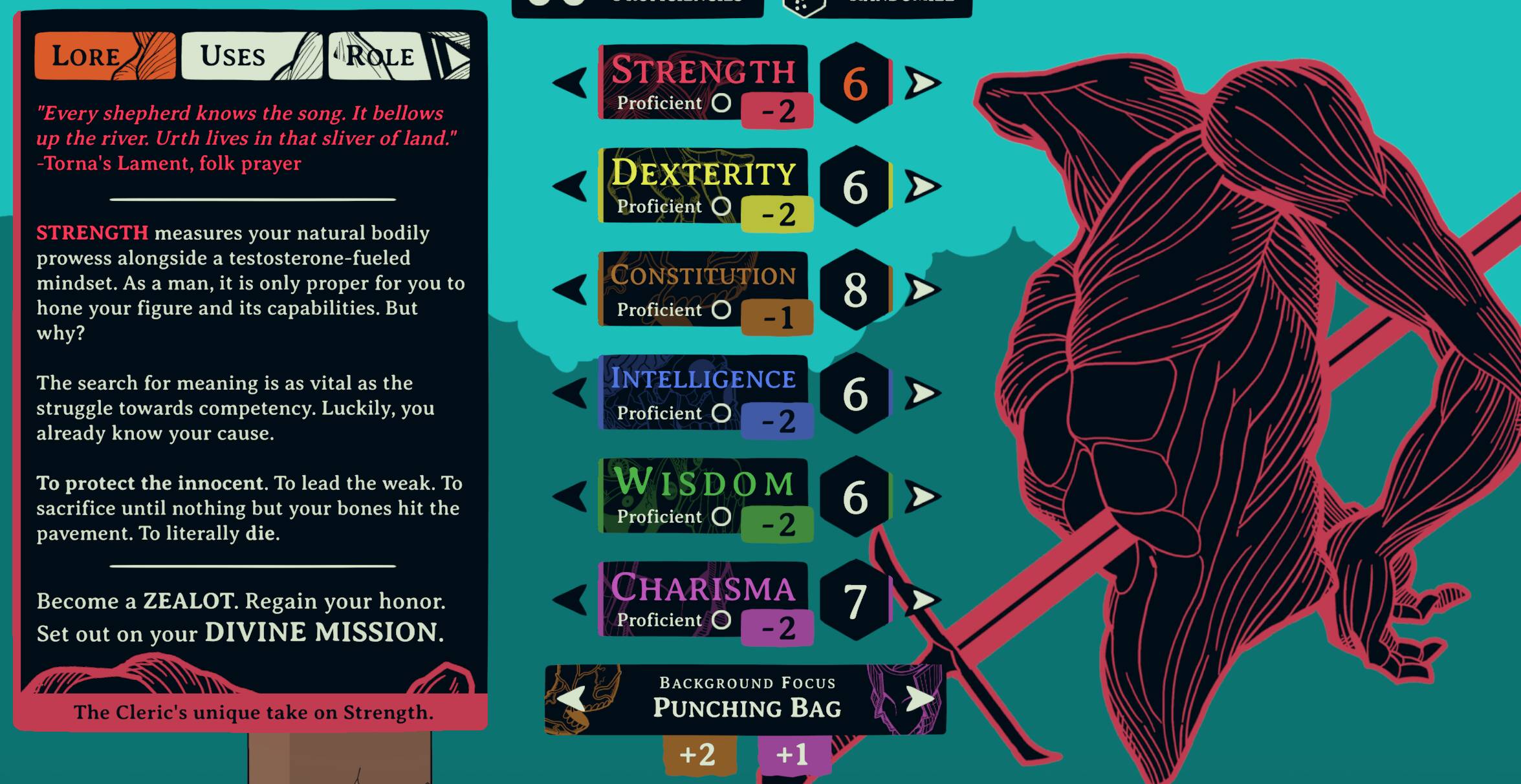 玩家可自行分配角色的六维属性值,而作者也在这方面下足了功夫——每个属性都附有一段韵味十足的文字描述,搭配使用场景与风格推荐。此外,玩家还可从作者预设的多种游玩风格中进行选择。不同的属性分配决定了“牧师”的行动能力,也让某些检定更有可能获得成功。
