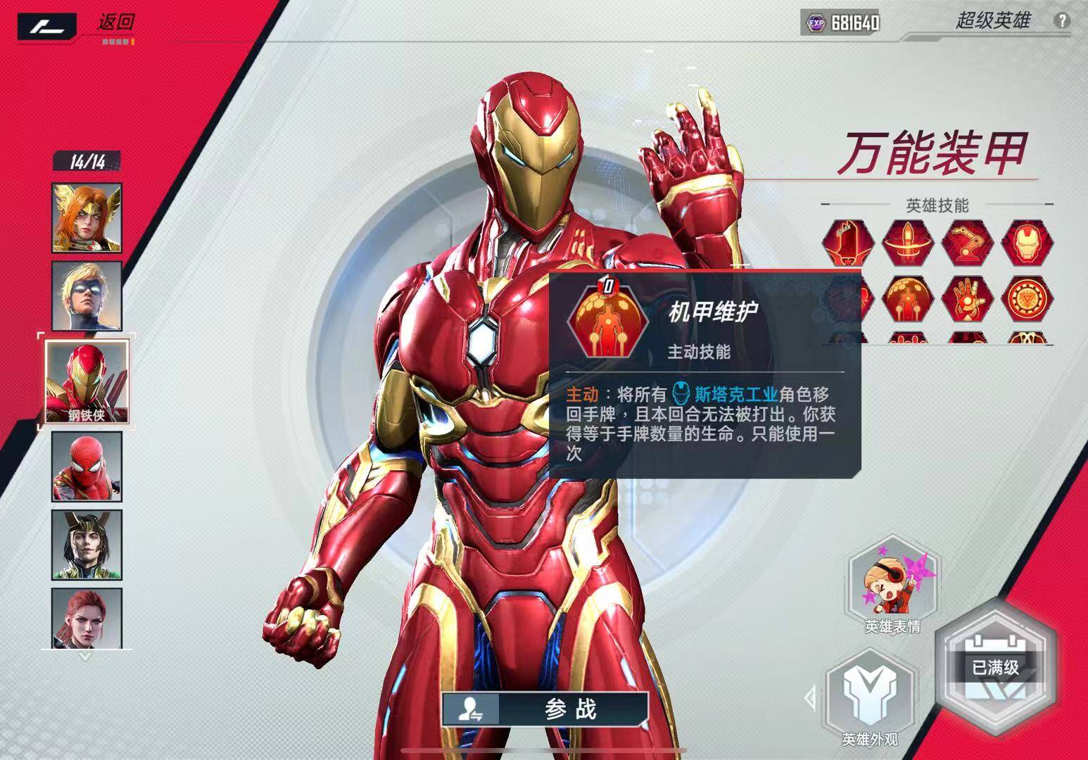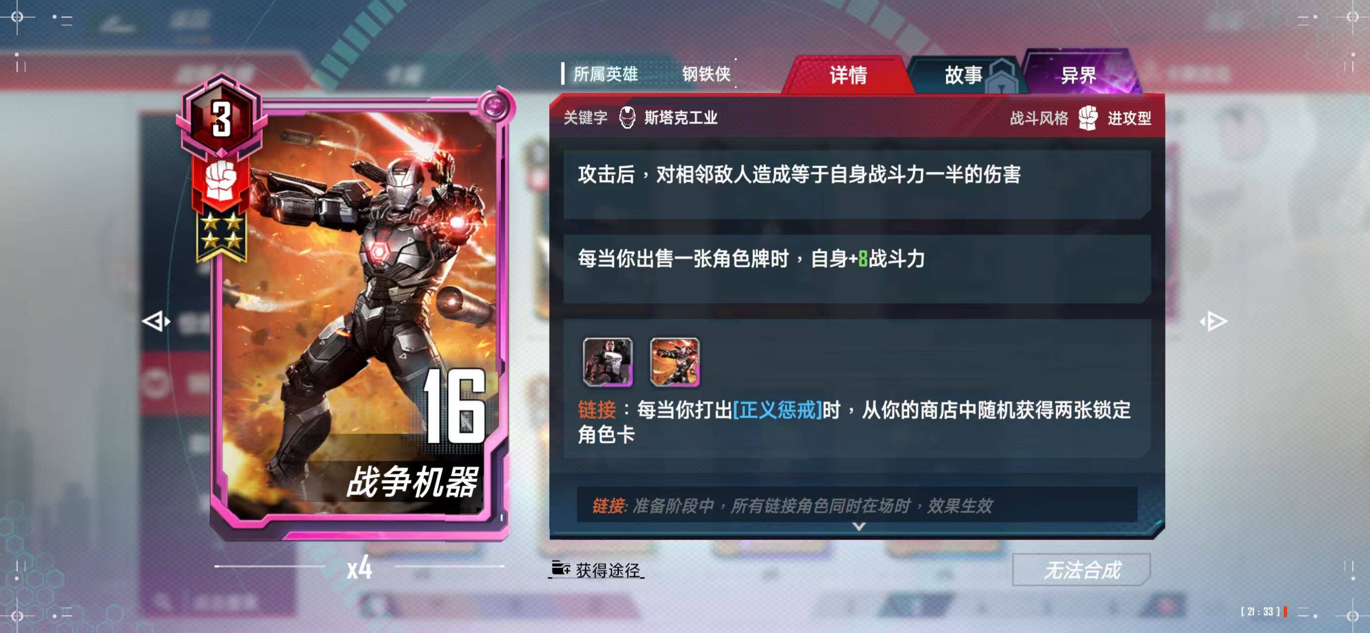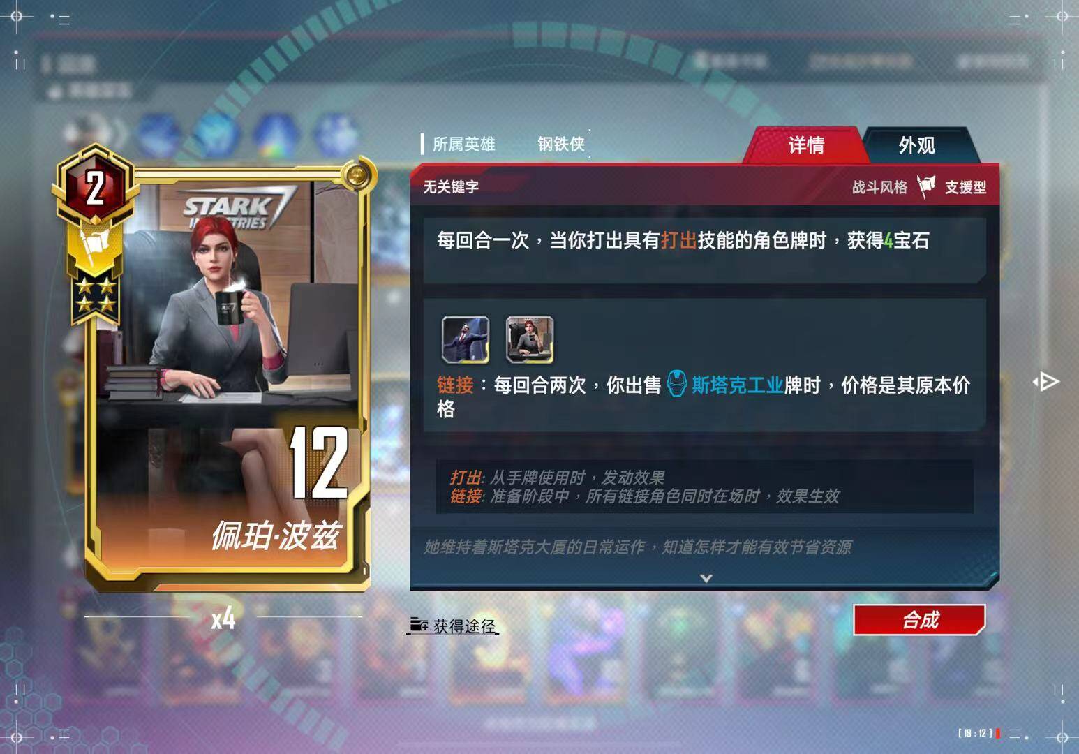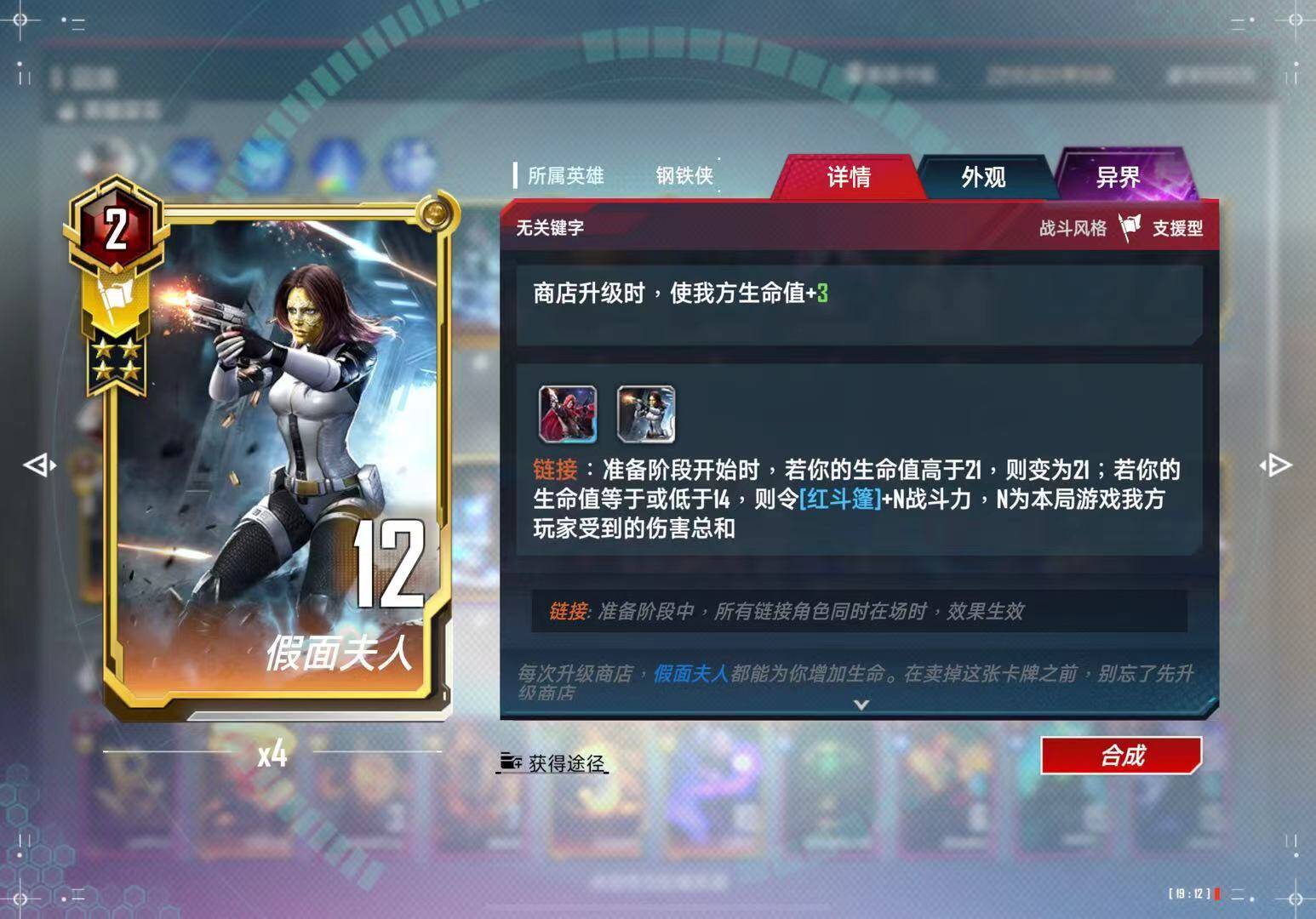技能评级:夯爆了。我的理解上这是一个变奏技能,让你从卡三的节奏中直接跳到五本开始搜索关键卡阶段,而且此技能提供的经济也是非常可观,技能检索到托尼就是12宝石还有免费3升5本10宝石。不过注意一点,在构筑中不能加太多的五费卡,不然有可能是检索不到托尼,构筑中应注意五本角色卡只带有经济收益的,例如薯片构筑中(默认超智锁)希娜只带一张援军虫子和一张可被力量宝石烧的提亚姆特,索尔五费则不带角色卡,选择带彩虹传送和方便滤卡的阿斯加德的召唤。这样使用此技能时,五费角色卡一共就五张:奥创、浩克、托尼、虫子、提亚姆特,五选三的情况下既没有托尼也没有虫子的概率就是10%。如果追求一定有能拿到二者其一就可以把提亚姆特再换成非角色卡牌。不过实战中我这么带卡十几个赛季还没有遇到过二者都没有的情况。