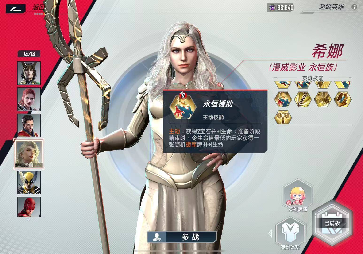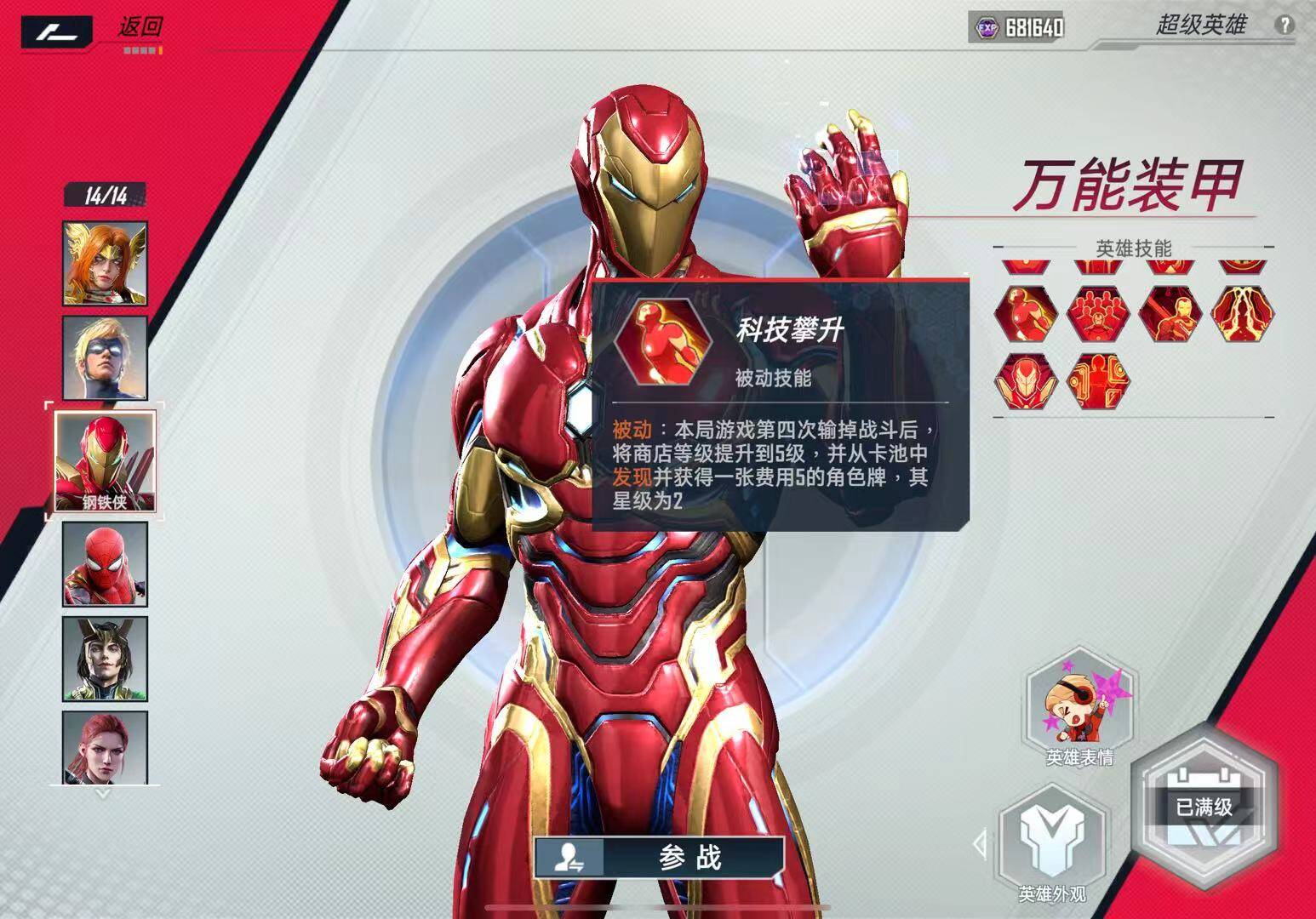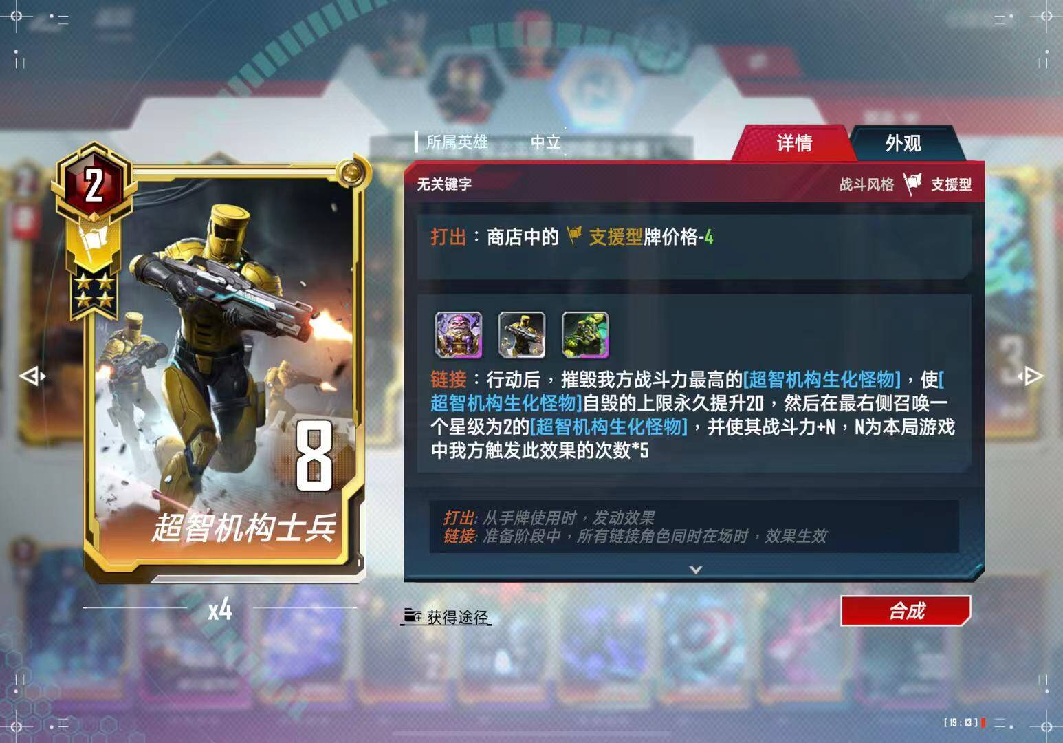 技能评级:夯爆了。我的理解上这是一个变奏技能,让你从卡三的节奏中直接跳到五本开始搜索关键卡阶段,而且此技能提供的经济也是非常可观,技能检索到托尼就是12宝石还有免费3升5本10宝石。不过注意一点,在构筑中不能加太多的五费卡,不然有可能是检索不到托尼,构筑中应注意五本角色卡只带有经济收益的,例如薯片构筑中(默认超智锁)希娜只带一张援军虫子和一张可被力量宝石烧的提亚姆特,索尔五费则不带角色卡,选择带彩虹传送和方便滤卡的阿斯加德的召唤。这样使用此技能时,五费角色卡一共就五张:奥创、浩克、托尼、虫子、提亚姆特,五选三的情况下既没有托尼也没有虫子的概率就是10%。如果追求一定有能拿到二者其一就可以把提亚姆特再换成非角色卡牌。不过实战中我这么带卡十几个赛季还没有遇到过二者都没有的情况。