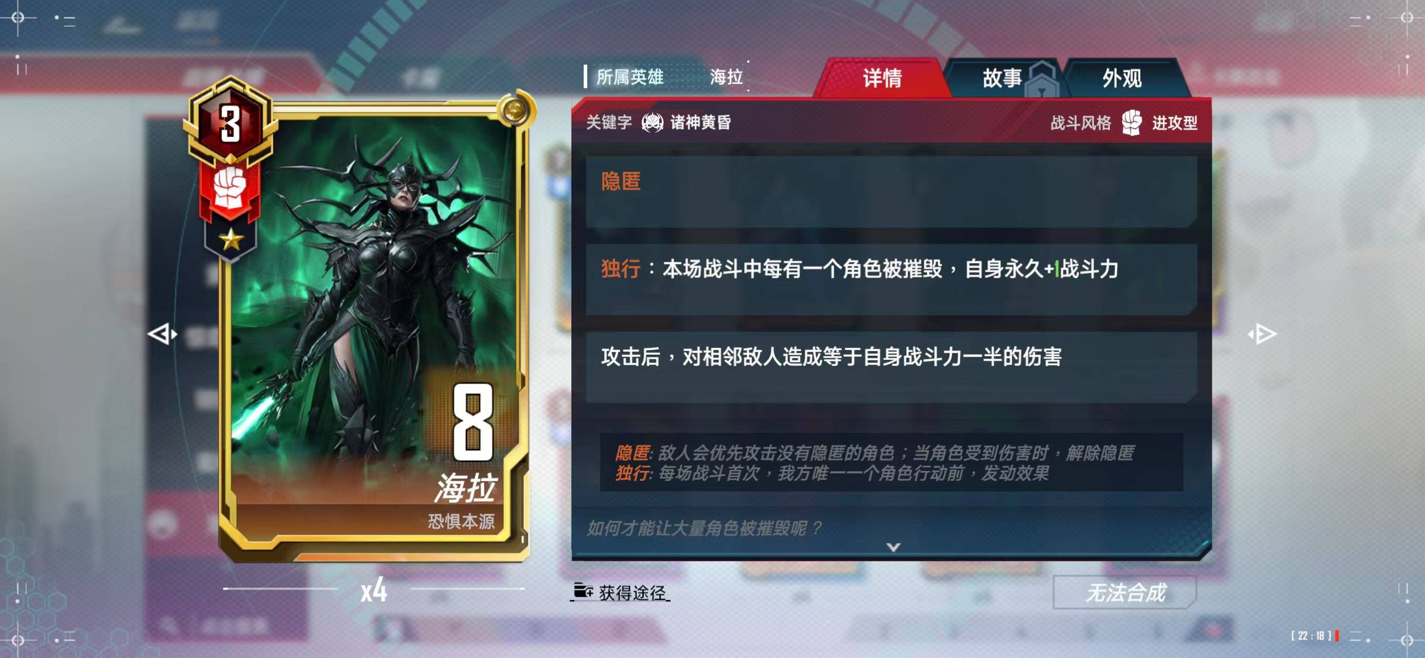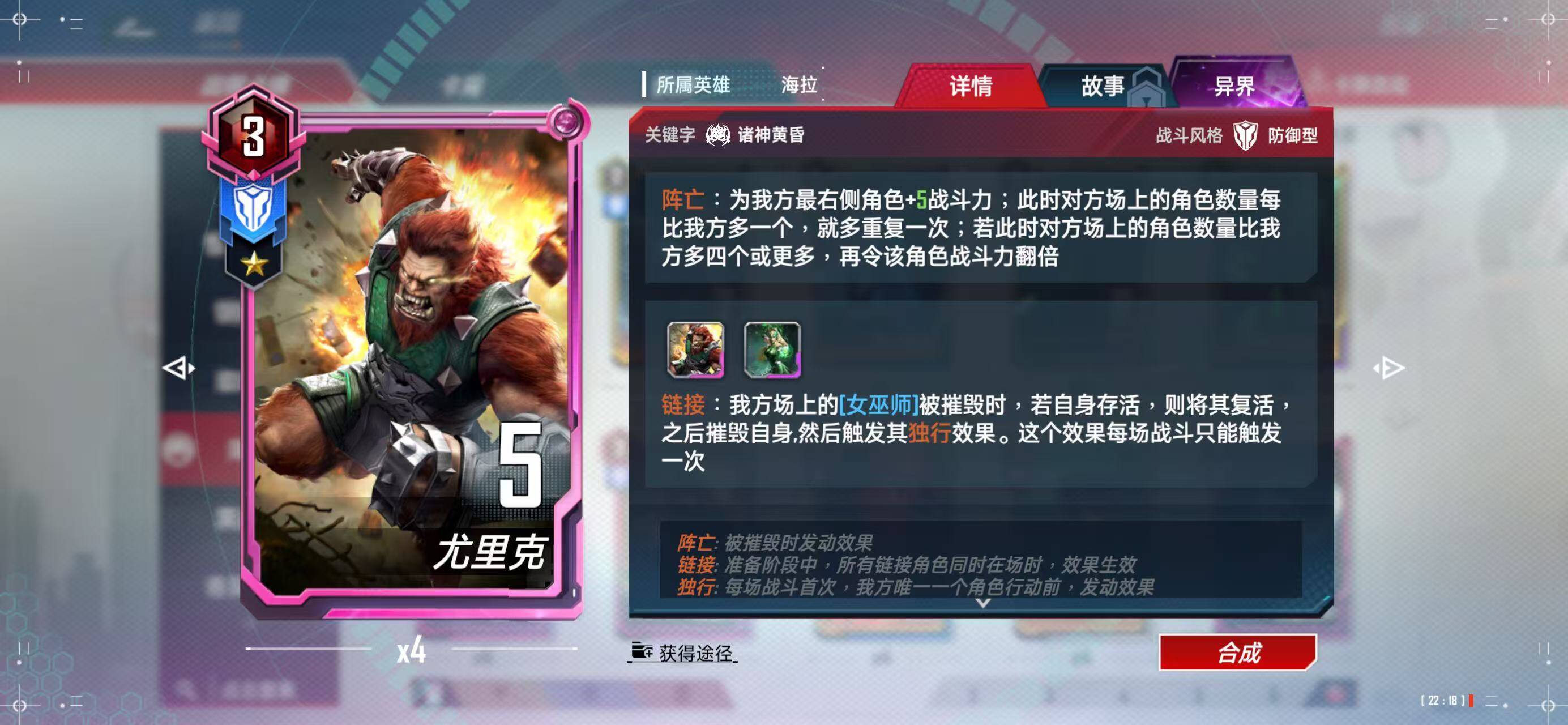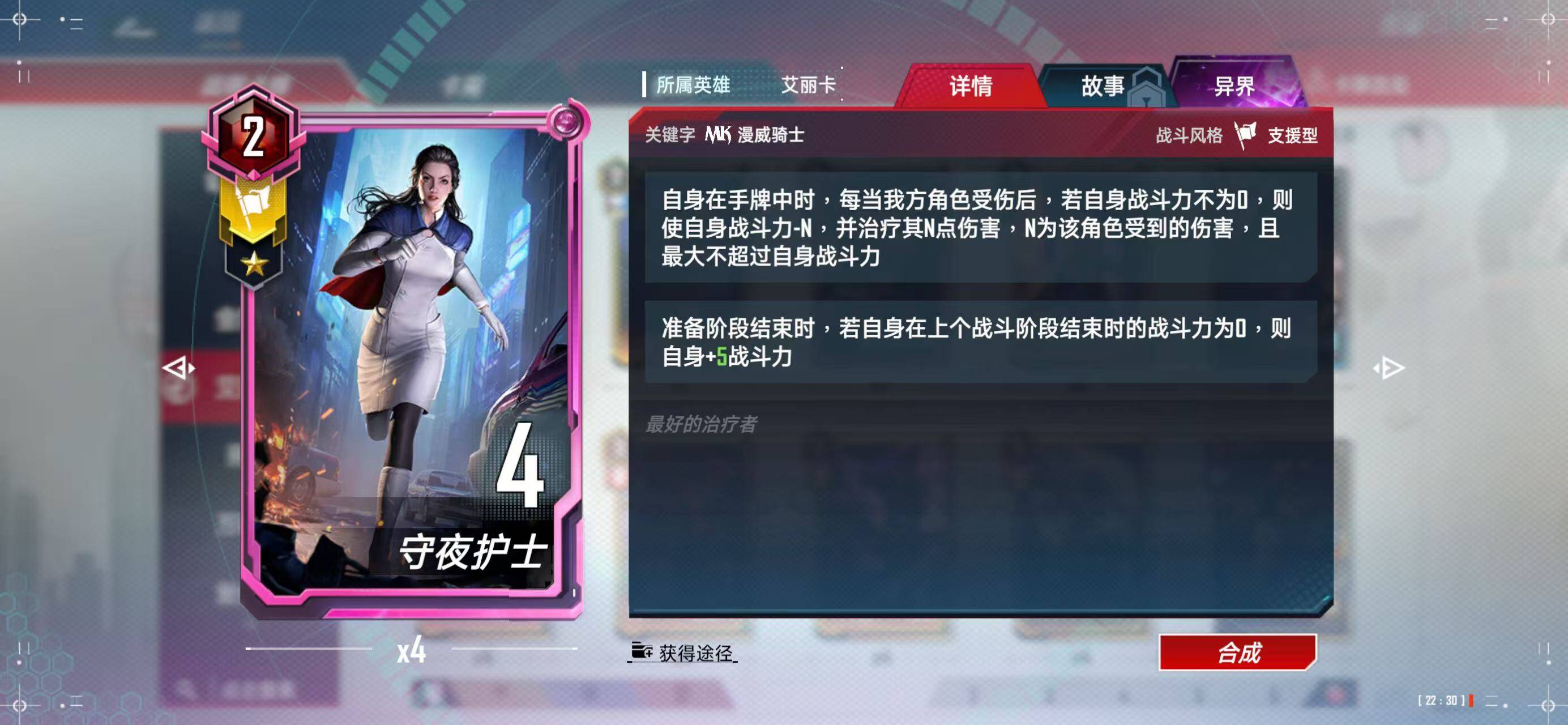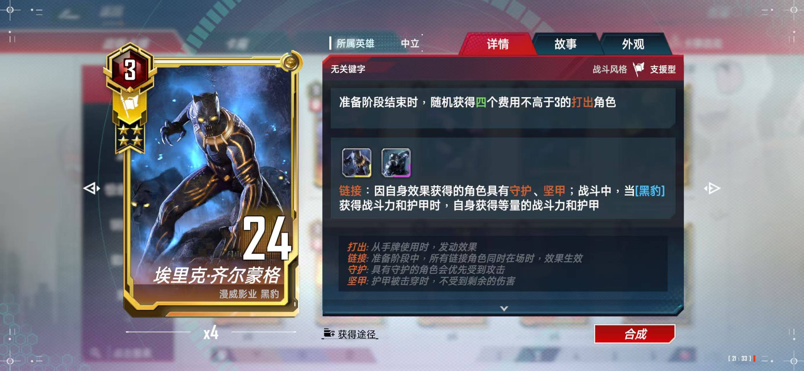 技能评级:夯爆了。我的理解上这是一个变奏技能,让你从卡三的节奏中直接跳到五本开始搜索关键卡阶段,而且此技能提供的经济也是非常可观,技能检索到托尼就是12宝石还有免费3升5本10宝石。不过注意一点,在构筑中不能加太多的五费卡,不然有可能是检索不到托尼,构筑中应注意五本角色卡只带有经济收益的,例如薯片构筑中(默认超智锁)希娜只带一张援军虫子和一张可被力量宝石烧的提亚姆特,索尔五费则不带角色卡,选择带彩虹传送和方便滤卡的阿斯加德的召唤。这样使用此技能时,五费角色卡一共就五张:奥创、浩克、托尼、虫子、提亚姆特,五选三的情况下既没有托尼也没有虫子的概率就是10%。如果追求一定有能拿到二者其一就可以把提亚姆特再换成非角色卡牌。不过实战中我这么带卡十几个赛季还没有遇到过二者都没有的情况。