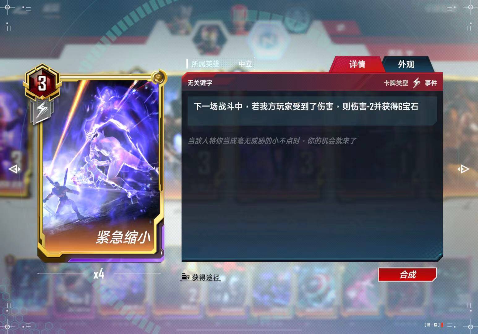 技能评级:全技能前三水平。在我心里为数不多可以跟英雄责任并肩的技能,不论是双四星夫人还是八缩小都是足以让你实现丝血反杀的奇迹。在一些做终幕的卡组中,还可以实现买两张就完成终幕。不过使用这个技能的时候就得把控好自己的血量,有时候就是贪八缩小给自己贪死了,缩小并不是越多越好的。这里详细说一下缩小的机制,感觉还是有很多人并不知道,假如别人入你10血,但是你打了8缩小,则实际只生效了5张缩小,对应也只会给你30宝石,多打出来的缩小就是打亏了。所以有时候缩小要适量贪,优先保证对局内活着,把每一张缩小用到实处才是关键。