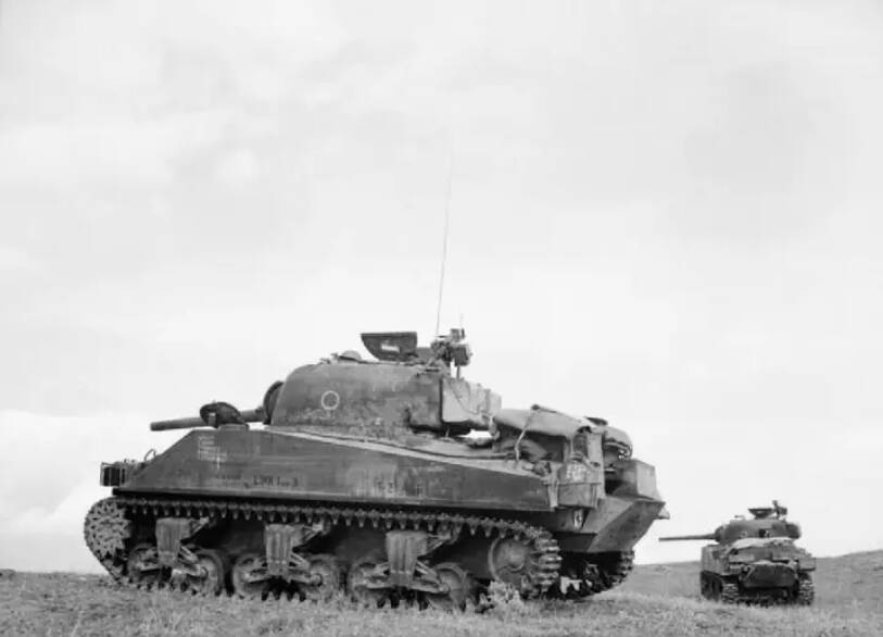 1944 年,意大利,第 46 皇家坦克团的谢尔曼坦克在背坡处支援步兵作战