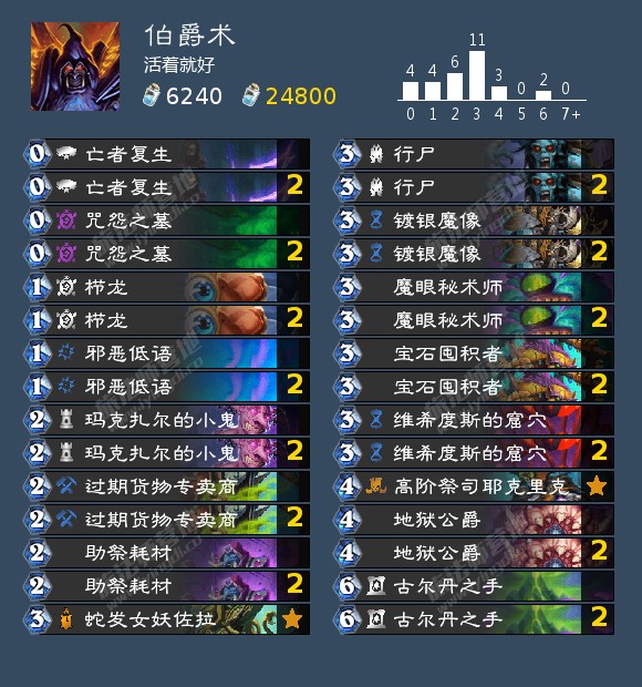 攻略就是起手找丹巴达尔碉堡,用奥秘苟着。后期血怒者暗月送给对手。下个回合先下野兔再下熔喉,一直撞血怒者。99的要撞56个回合,真心累啊。