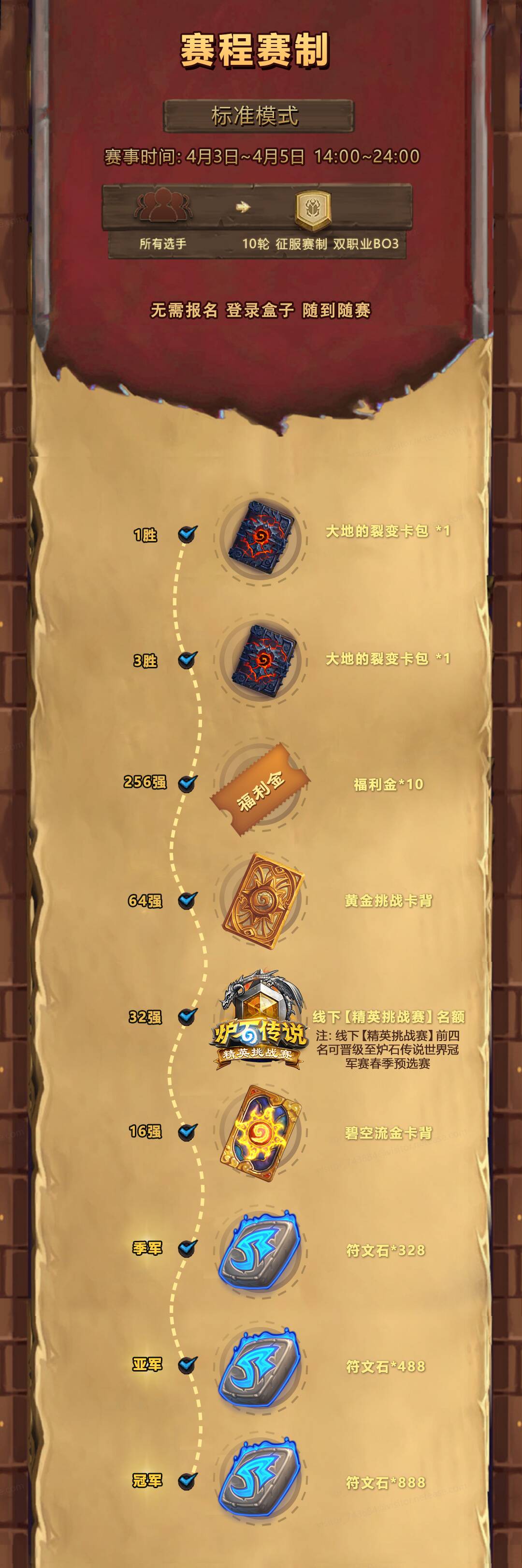 和去年几乎一样,挑战者赛道是国服炉石电竞选拔体系三条赛道中对广大普通玩家最友好、门槛最低的赛道,每赛季两场基于官方插件的线上挑战赛,各取32人晋级该赛季线下的精英挑战赛,后者的前四名再晋级当季季赛。只是从季赛起直接晋级年终总决赛,某种程度上相当于所有基层赛事都提升了一个级别。