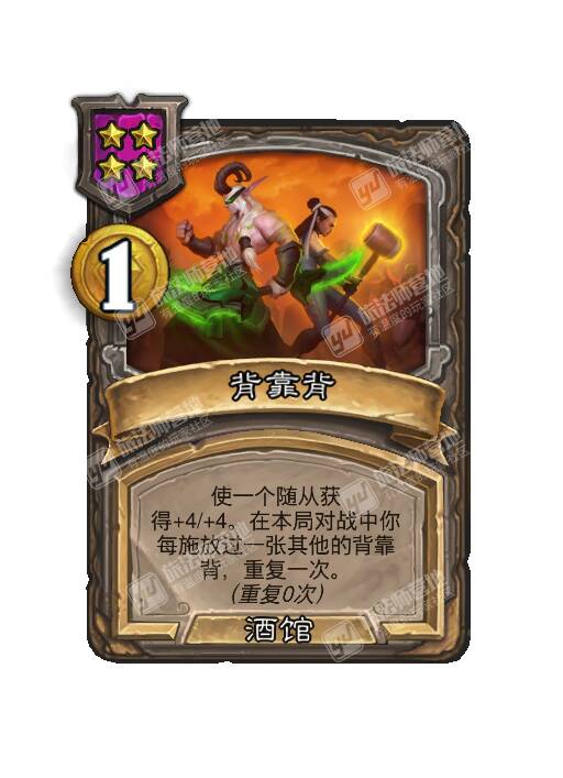 - [4星1费] 使一个随从获得+4/+4。在本局对战中你每施放过一张其他的背靠背,重复一次。