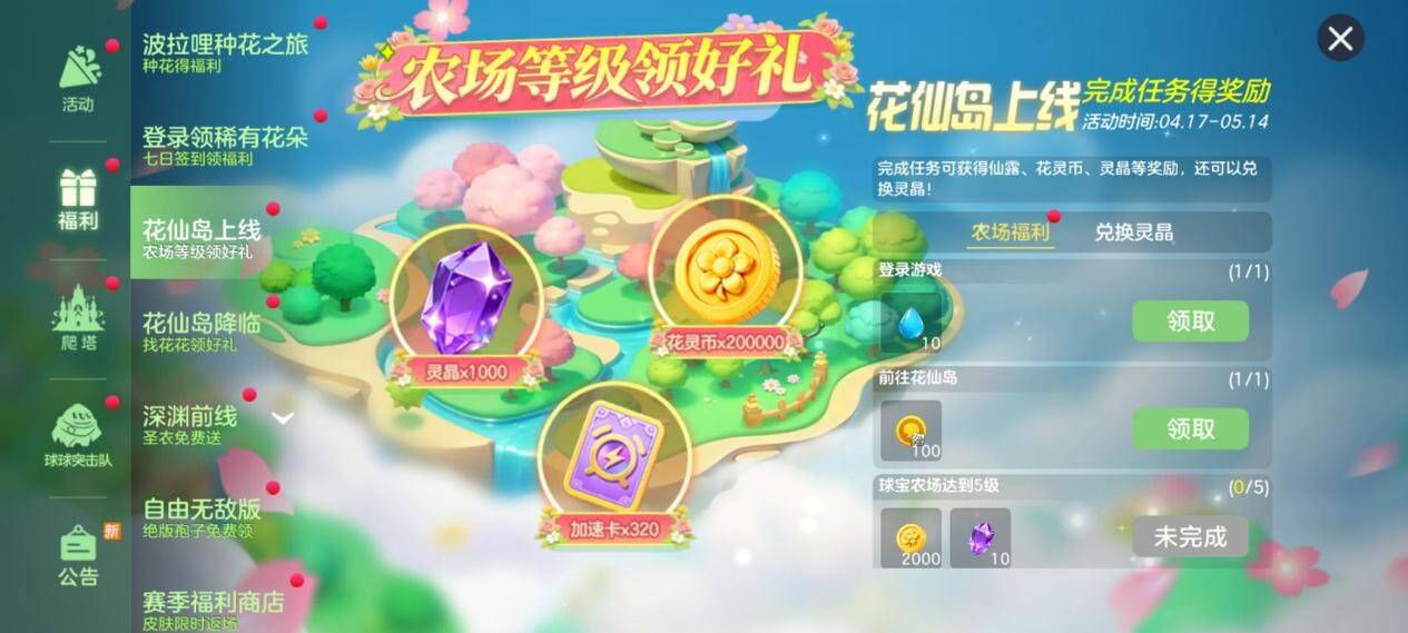 为庆祝花仙岛上线,4月17日至5月14日提升球宝农场等级领取海量好礼,最多可以免费获取1000灵晶、200000花灵币、320加速卡等奖励!赶快前往游戏提升自己的农场等级,兑换福利!