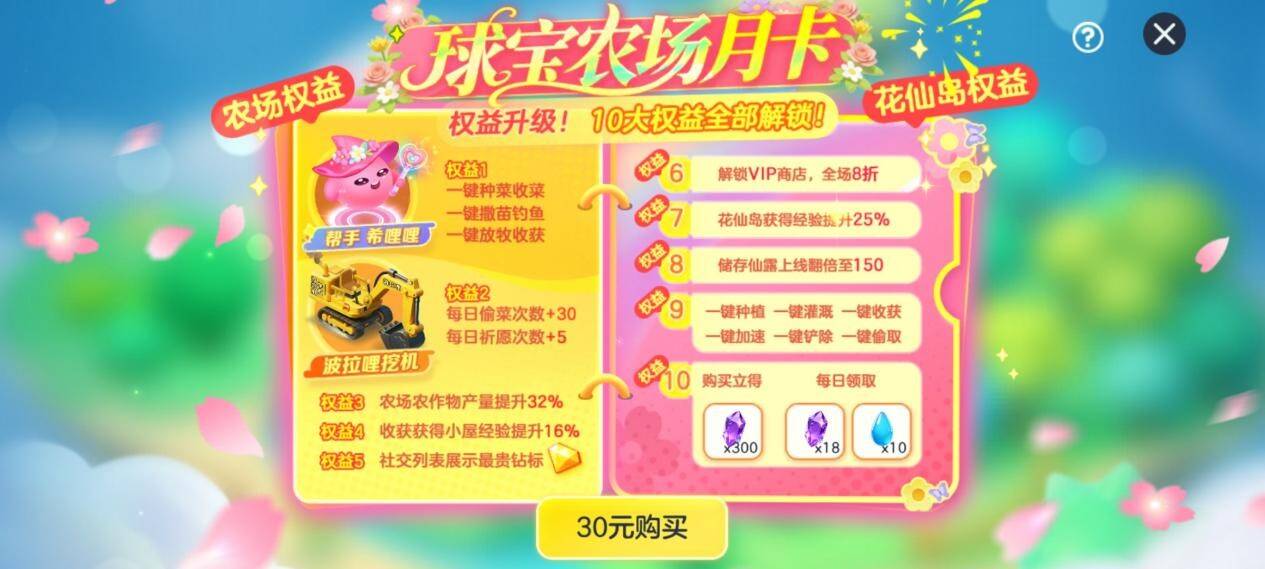开通花仙岛月卡还能解锁更多权益:购买立得300花灵币、每日领取18花灵币+10体力、VIP商店全场5折、一键解放双手、体力储存上限翻倍等10大权益。