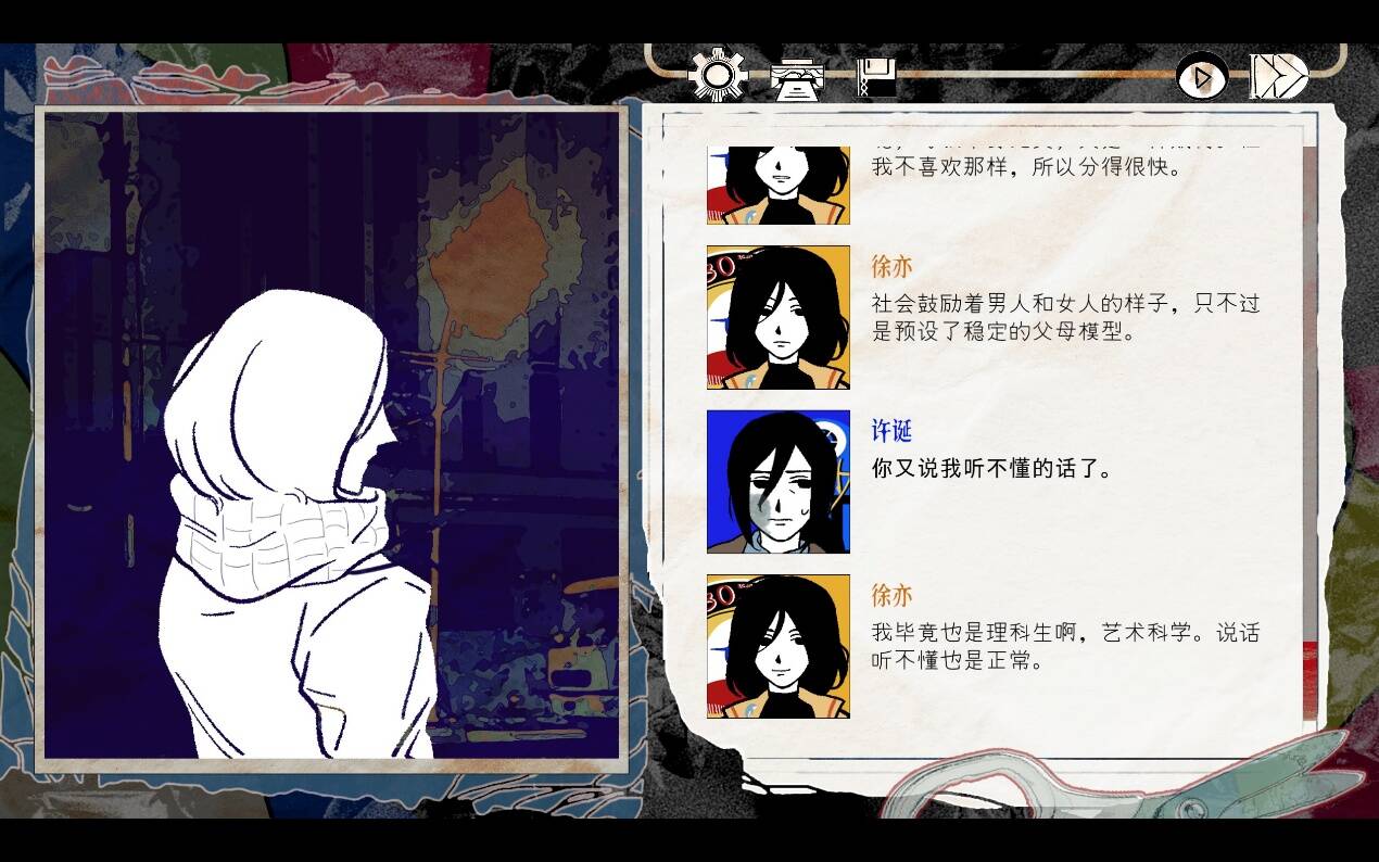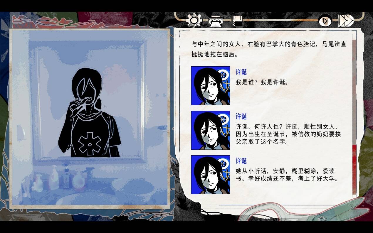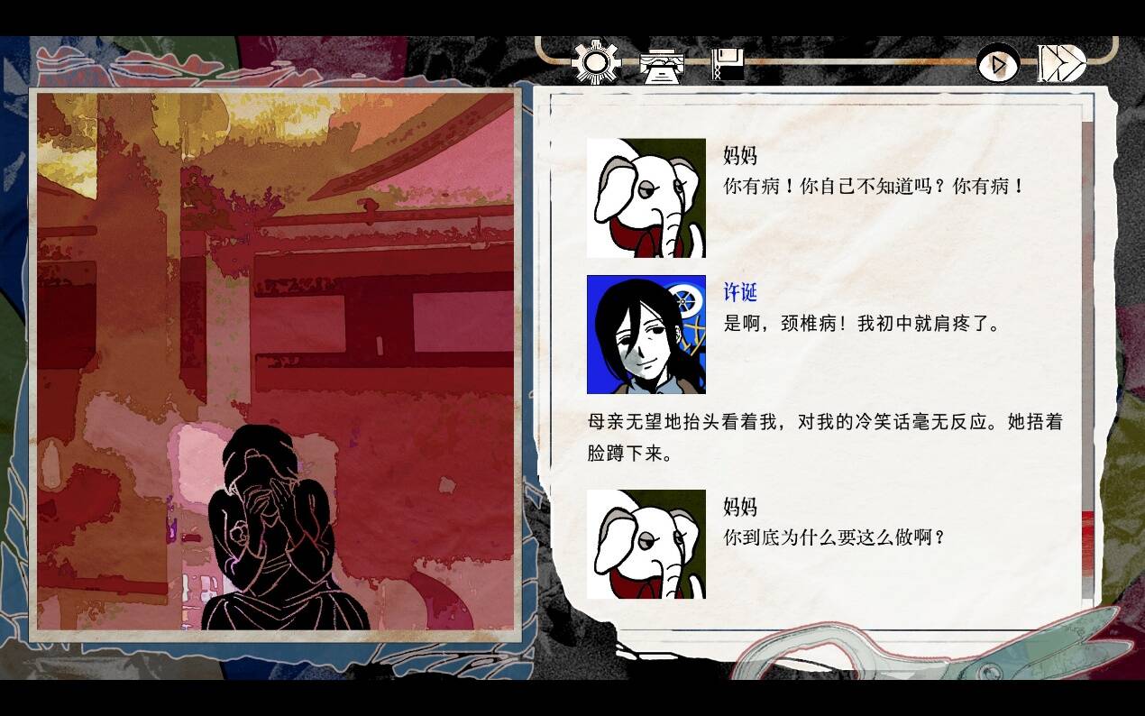 如果说同工作室的前一个作品《洞石火》还在讨论一个就事论事,甚至带有宗教、幻想色彩的故事,那么《颈椎病》就是干脆地尝试把现实生活中的“刺痛”用简短的、标签化的角色快速的呈现在玩家面前。无论是作品中反复变化的描述口气,还是不同线路中角色的故事线,与其说作者在讲述许诞等人的生活,不如说在引导玩家代入到某些角色本身的轨迹中去——然而正如创作者自己所说: