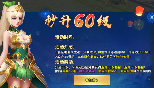 - 等级直升六十级(4月24日14:00-4月29日6:00):入驻新服即可直升60级,并领取全套装备及坐骑福利,大幅缩短升级时间,领先别人一步称霸龙武!